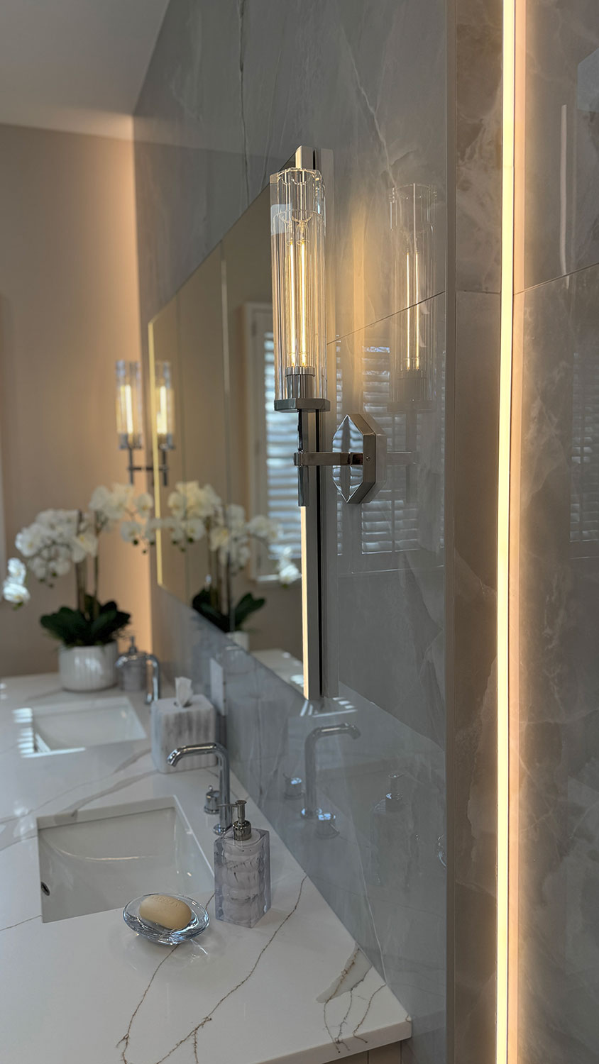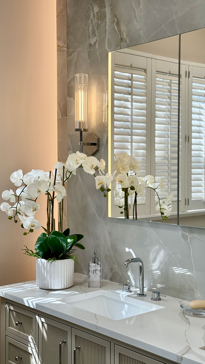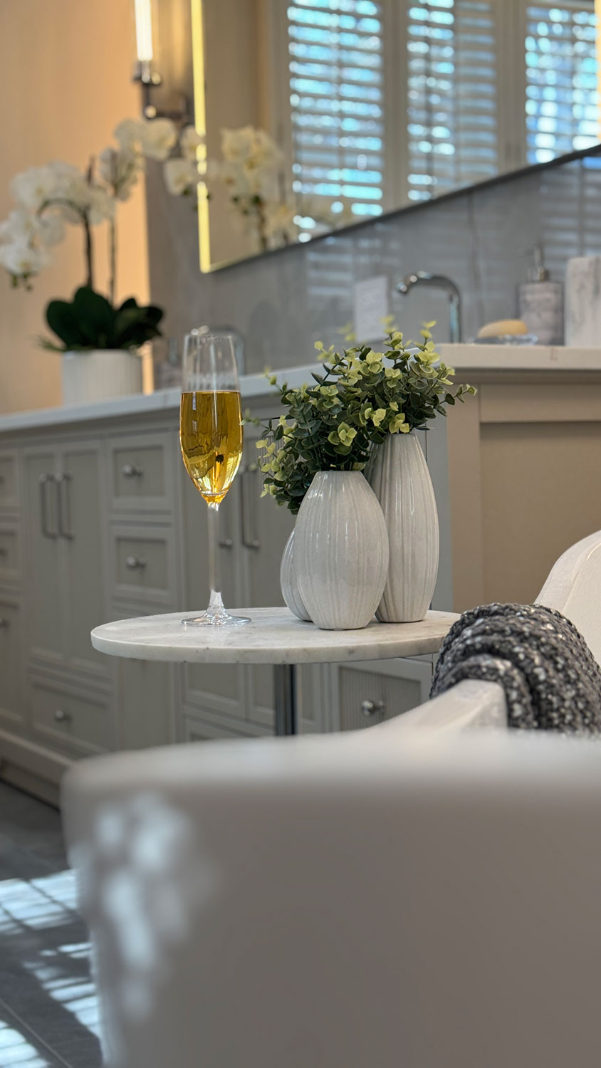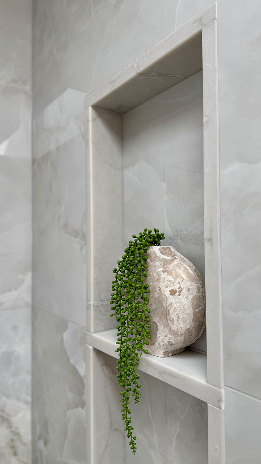 Step into serene luxe retreat, where contemporary elegance meets spa-like tranquility. This luxurious bathroom showcases large-format porcelain tiles with a marble-inspired finish, creating a seamless and sophisticated look. A freestanding soaking tub invites relaxation, complemented by a sleek wall-mounted tub filler and a modern LED chandelier that adds a touch of opulence. The glass-enclosed shower features intricate floral mosaic tile accents, built-in shelving, and a rainfall showerhead for a serene, immersive experience. Thoughtfully designed with neutral tones, integrated lighting, and refined textures, this space embodies modern luxury and effortless relaxation.